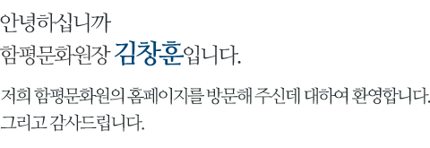 특히 호남가 첫 고을 의향 함평의 역사에 걸맞은 문화원을 만드는데 신명을 바쳐 일하겠습니다. 제 자신 아직도 많은 부족함을 절감하고 있습니다. 각별하신 성원과 가르침을 간곡히 구합니다. 저희들이 심혈을 기울여 새롭게 단장한 함평문화원 홈페이지가 함평 문화를 알고자 하시는 모든 이들에게 도움이 되기를 소망합니다.